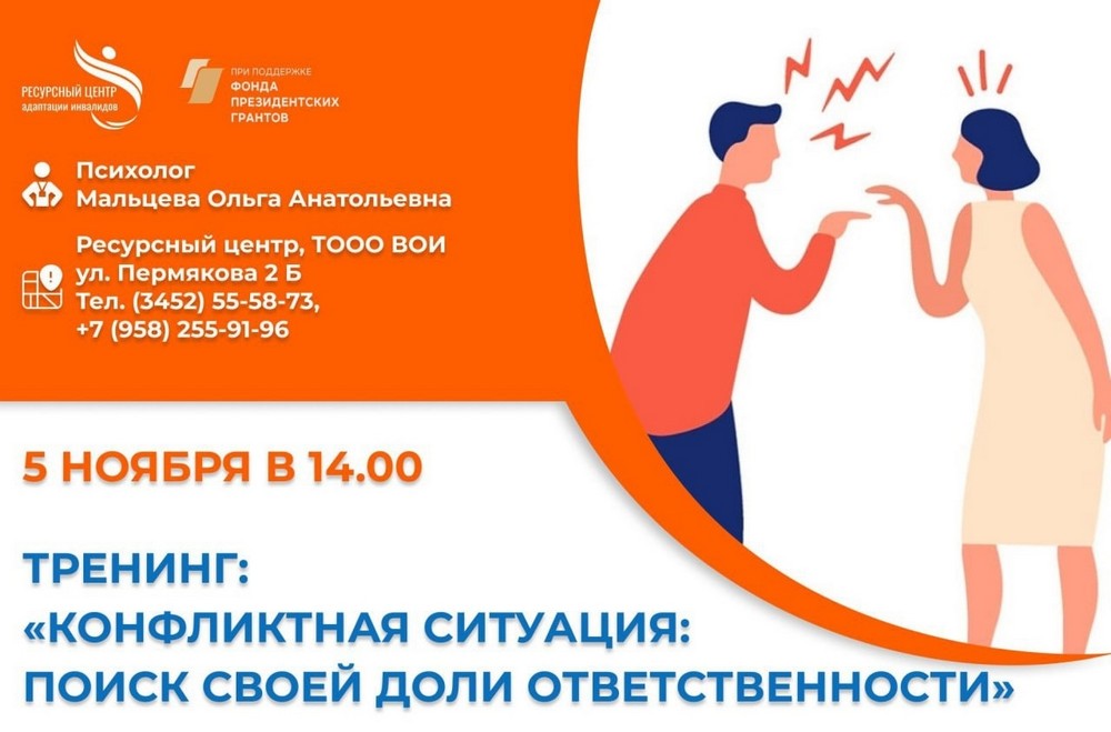 05 ноября в 14.00 в Ресурсном центре адаптации инвалидов (ул. Пермякова, 2б) состоится тренинг "Конфликтная ситуация: поиск своей доли...
