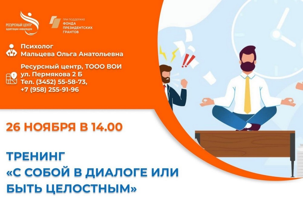 26 ноября в 14.00 в Ресурсном центре адаптации инвалидов (ул. Пермякова, 2б) состоится тренинг "С собой в диалоге, или Быть целостным." Проведет...